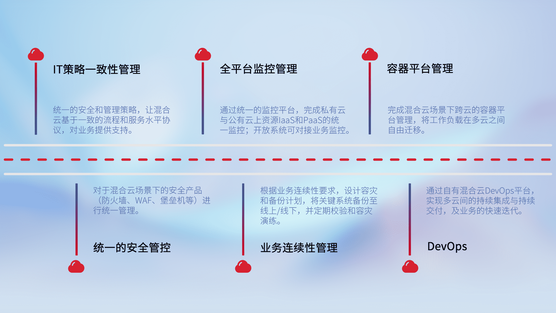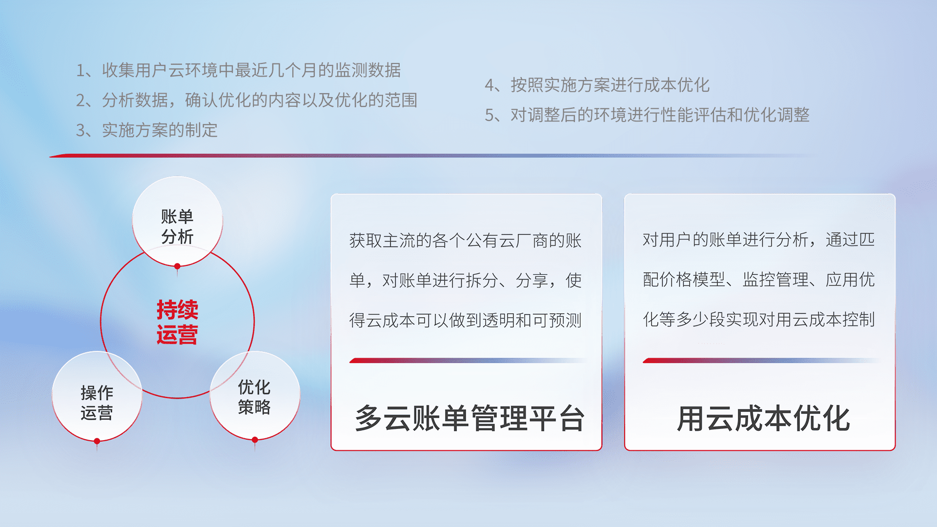 通过多云纳管,,,,以统一的资源数据模型把客户的云资源进行抽象和封装,,,进而实现对多云资源的统一操作,,,保障云资源管理的可靠性、、、稳定性与可用性。。量身定制化运维内容,,配置、、、开发运维、、、补丁管理、、、、备份、、、监控、、、、认证和访问管理、、、、审计和日常巡检等,,保障在用云过程中的可靠度,,稳定度以及高可用率。。。。