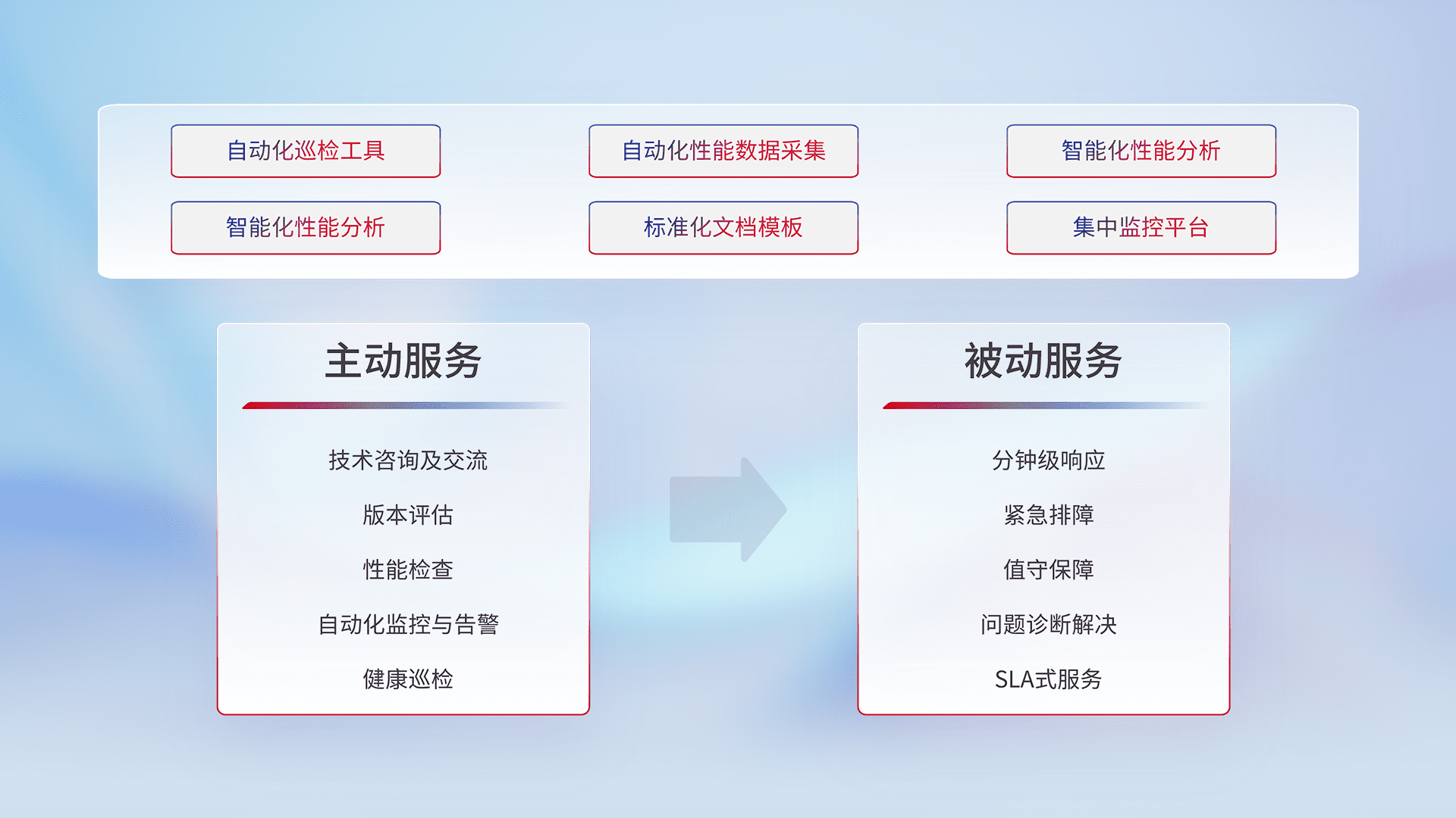 智能化工具和标准化文档,,,保障服务质量,,,,提供主动服务(包含技术咨询、、、、版本评估、、性能检查、、自动化监控与告警、、、、健康巡检)和被动服务包含(分钟级响应、、紧急排障、、值守保障、、、问题诊断解决、、、SLA服务)。。。。